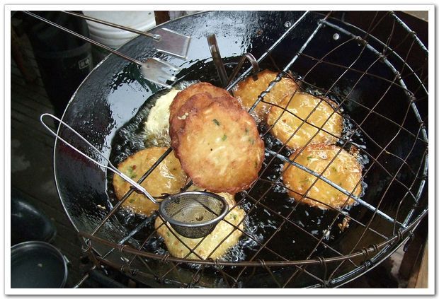 在融水的滤粉摊和刮盆粉店门口大部分都会有现炸的铜瓢粑卖,融水人习惯用铜瓢粑配着米粉吃,吃的时候还可以加点摊上的青辣椒酸水,香!脆!吃了还想吃!