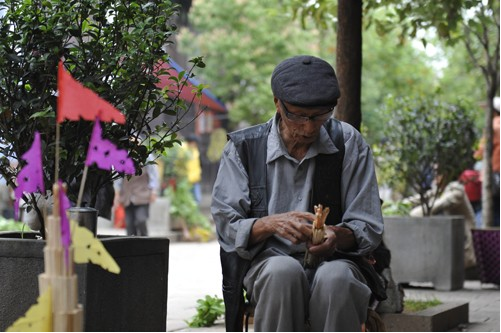 早上十点左右,火把就快扎好了。色彩鲜艳的纸裱斗升上各色卷着的彩旗正一个个被打开,梨、苹果、花红正被栓成一串串地挂在树枝上,水泥桌上摆着小旗、炒蚕豆和糖果等,老人们在一旁边笑边聊,一盘彩色米干在灿烂的笑着。